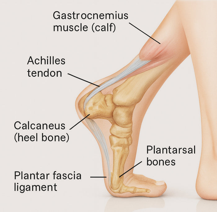 Tight calves and stiff ankles pull on the fascia that runs through your heel, creating painful flare ups with every step. This constant tension is why standing, walking, or even getting out of bed can feel unbearable.
